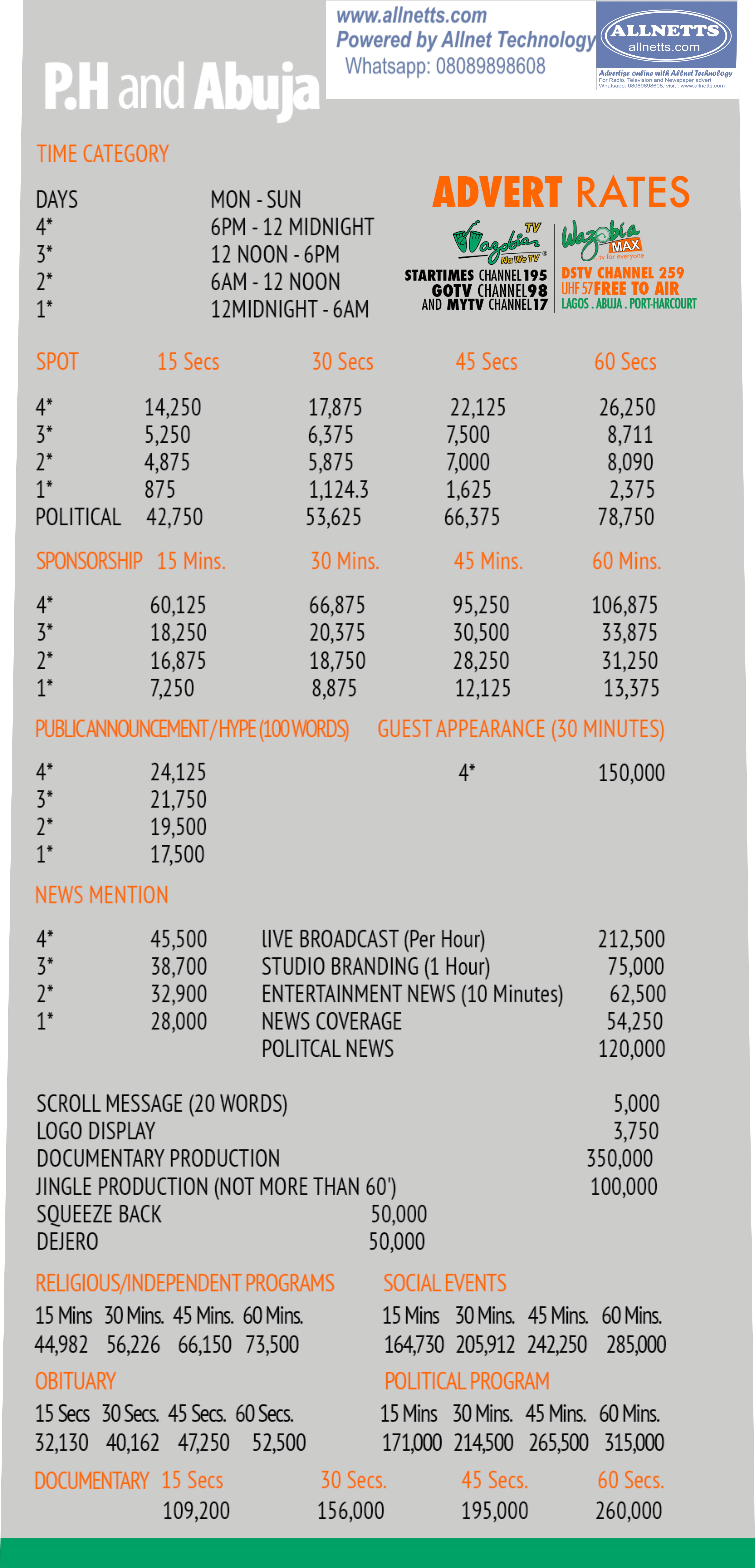 All NTA Advert rates